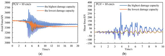 The axial force time history curves were extracted when the peak axial forces in the central column reached their maximum and minimum values under seismic actions with the same PGV amplitude. The shear force time history curves for the central column were extracted using the same method. The results are shown in Figure 3. In order to create a sharp contrast in the figures, three conditions were selected while PGV was 10 cm/s, 40 cm/s, and 120 cm/s.
