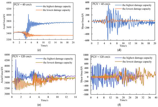 Time history curve of axial force and shear force: (a) axial force time history curve, PGV = 10 cm/s; (b) shear force time history curve, PGV = 10 cm/s; (c) axial force time history curve, PGV = 40 cm/s; (d) shear force time history curve, PGV = 40 cm/s; (f) axial force time history curve, PGV = 120 cm/s; (e) shear force time history curve, PGV = 120 cm/s.