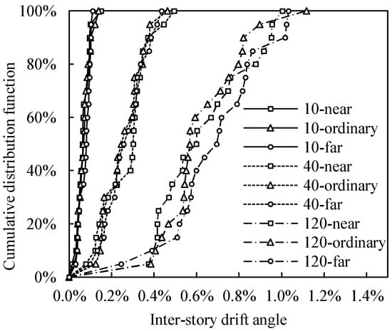 Figure 4 shows the cumulative distribution function of the structural inter-story drift angle in this condition. From Figure 4, it can be observed that the distribution range of structural response is not significantly affected by different rupture distances under seismic conditions with the same PGV amplitude.