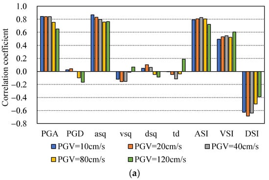 Based on the same amplitude of PGV, we analyzed the applicability of the severest parameters for describing structural seismic response through calculation of correlation coefficients, then examined the trend of correlation coefficients with the changes in seismic intensity. The correlation between the structural response and the severest parameters at different seismic intensities was calculated, and the results are shown in Figure 5. In these conditions, the station site was modeled with a soil shear wave velocity (Vs20) of 280 m/s.