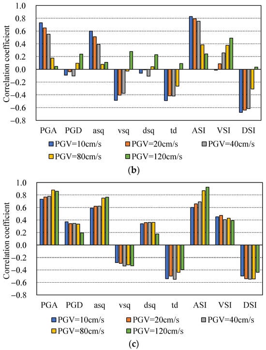 Correlation coefficients between structural response and the severest ground motion parameter under different intensities with a shear wave velocity of 280 m/s: (a) near-field earthquake (R < 20 km); (b) ordinary earthquake (30 km < R < 70 km); (c) far-field earthquake (R > 80 km).