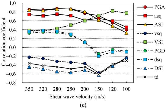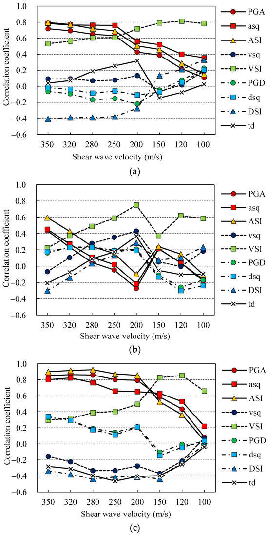 Correlation coefficient between structural response and the severest parameter under different shear wave velocities with PGV = 80 cm/s: (a) near-field earthquake (R < 20 km); (b) ordinary earthquake (30 km < R < 70 km); (c) far-field earthquake (R > 80 km).