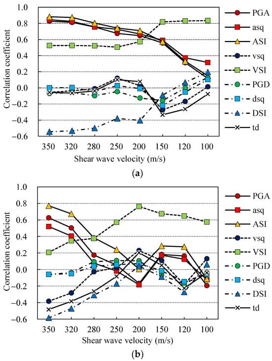 In order to analyze the influence of the site on the seismic damage capacity, we examined the correlation coefficients between structural response and the severest parameters for eight site conditions, including Class II sites with shear wave velocities of 350 m/s, 320 m/s, 280 m/s, 250 m/s, and 200 m/s and Class III sites with shear wave velocities of 150 m/s, 120 m/s, and 100 m/s. The PGVs of the input seismic motions were 120 cm/s and 80 cm/s, respectively. The results of the calculation are shown in Figure 6 and Figure 7.