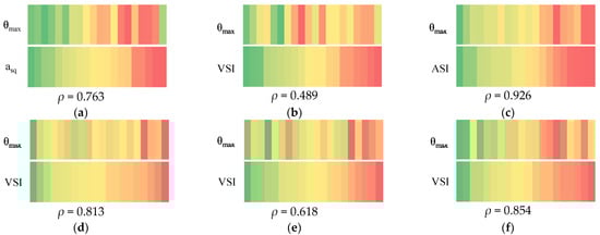 As shown in Figure 8, the correlation coefficient in Figure 8c is 0.926, and the color order of the inter-story drift angle is basically the same as that of the severest parameter. In Figure 8a,d,f, the correlation coefficients are 0.763, 0.813, and 0.854, respectively, indicating that the size of the severest parameter can roughly reflect the seismic damage capacity. The correlation coefficients in Figure 8b and e are 0.489 and 0.618, respectively. It is obvious that the correspondence between the size of the severest parameters and the structural response is relatively poor. Overall, when the correlation coefficient is relatively high (greater than 0.8), the selected size of the most critical indicator can be used to rank the seismic damage capacity.