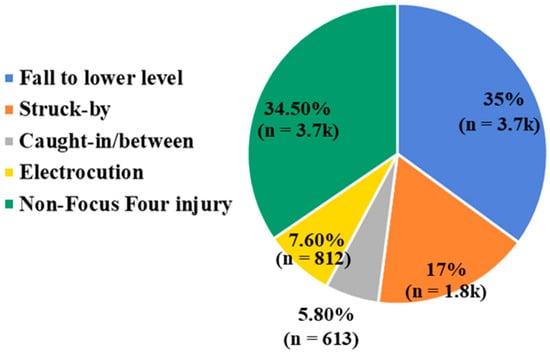 Severe and fatal accidents persist in the fourth industrial revolution era, which is characterized by more advanced, sophisticated, and complex industrial systems. Advanced countries, such as the United States (U.S.) and Europe, have established and implemented various industrial accident reduction measures to substantially reduce industrial accidents and ensure safe workplaces for workers []. The construction industry represents one of the most dangerous industries in most countries, and most construction accidents are caused by falls, bumps, hits, crushing, pinching, and electric shocks []. In the U.S., approximately 10,000 construction workers died from on-the-job injuries between 2011 and 2021. Among them, 65.5% were due to four main accident types: fall, struck-by, caught-in, and electrocution accidents. Further, falls accounted for more than half (53.5%) of the four main accident types, as well as 35.0% of all fatal injuries during construction (Figure 1) []. In Korea, construction accidents follow similar trends to those in the U.S., accounting for more than 50% of all industry-related fatalities, and the accident types include “Falls”, “Struck-by”, “Caught-in/between”, “Hit by an object”, and “Be crushed” accidents []. Notably, the U.S. does not record secondary accidents caused by electrocution, whereas Korea considers secondary accidents caused by electrocution as direct accidents; therefore, the same accidents are grouped under different types of accidents in both countries.