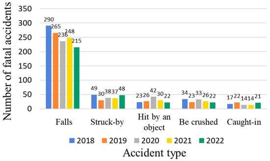 In 2022, the construction industry accounted for 402 (46.0%) fatalities in Korea, followed by the manufacturing, 184 (21.1%); service, 150 (17.2%); and transportation, warehousing, and communication industries, 104 (11.9%). Construction and manufacturing are considered high-risk industries, accounting for over 70% of all annual fatalities []. When considering the number of fatalities in the construction industry in 2022 based on the accident type, “Falls” accounted for 215 (53.5%), followed by “Struck-by”, 48 (11.9%), “Hit by an object”, 22 (5.5%), “Be crushed”, 22 (5.5%), and “Caught-in/between”, 21 (5.2%) accidents. Furthermore, the number of fatalities between 2018 and 2022 based on the accident type reveals that “Falls”, “Struck-by”, “Hit by an object”, “Be crushed”, and “Caught-in” accidents accounted for most fatalities (Figure 2).