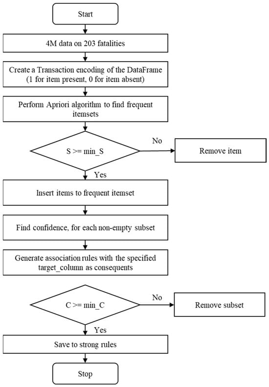 The Apriori algorithm utilizes support (frequency), confidence (probability), and enhancement (correlation) to create association rules []. Figure 3 shows a more detailed description of each step. First, we converted the data obtained from the 4M classification of the 203 deaths into transactions, and each transaction was represented as a set of items. For example, in the incident data, one transaction could represent all 4Ms categorized in a fall incident. Second, a frequent item set was generated based on a support map. The support map indicates the frequency at which a particular item set appears in all transactions. It searches for item sets above a certain threshold. For example, if the item “human error” is frequently applied, a set of items containing “human error” might be considered a frequent item set. Third, association rules were generated based on the frequent item sets. The Apriori algorithm sets the form of the rule as {A} => {B} and evaluates the rule using metrics such as support, confidence, and improvement. The resulting rules represent the interrelationships among specific incident types and the 4M classifications.
