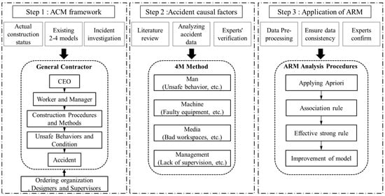In this study, we applied the 4M-based accident cause analysis to the ACM framework and analyzed the association between accident causes by accident types using ARM. Specifically, we collected reliable data on construction industry accidents managed by the government through web scraping and refined the influencing factors of the existing 2–4 model by analyzing the accident history and 4M classification. Next, based on the ARM accident cause analysis for each of the five main construction industry accident types, we analyzed the relationship between single and multiple causes through network graphs, deriving the dominant accident causes and safety management measures according to the accident type and group. Through a series of processes, we proposed an improved ACM framework based on the accident cause analysis and proposed safety management measures for each construction work subject. The results of our study are summarized as follows: