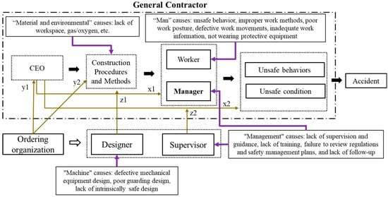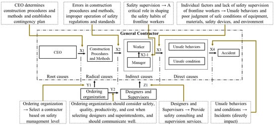 The occurrence of accidents is influenced by the contractor, as well as the design and supervisors associated with the contractor. These stakeholders influence the contractor’s internal safety management by overseeing the construction process and providing technical and financial support. The CEO of the contractor determines the safety management behavior and the ability to improve the safety culture, ultimately influencing the safety performance of the construction project, which is considered an ROC []. Deficiencies in construction procedures and technical planning can readily expose frontline workers to hazardous working conditions that are considered RACs. ICs result in more dangerous behaviors and conditions in construction sites due to the lack of safety supervision and the poor individual factors attributed to frontline workers. Unsafe behaviors and conditions directly cause accidents and are considered DCs [].