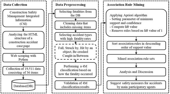 First, web scraping was applied to the accident cases reported to CSI. CSI provides an application programming interface, although it has a daily usage limit. Therefore, we applied web scraping using Python by analyzing the HTML structure of CSI web pages; thereafter, the collected data were only used for public research purposes. Next, the data were preprocessed and categorized. We extracted accident records with a minimum of one fatality from the collected data and excluded the cases with NAN cells from the 36 categories. Thereafter, we selected five accident types with high fatality rates (fall, hit, crushed, hit by an object, and entanglement) and performed the 4M classification based on the data provided by Korean safety-related public organizations and cross-validated by researchers to ensure the reliability of the classification results. Finally, ARM was deployed to identify the accident causes, after which the results were analyzed, followed by the proposition of safety measures for each subject.