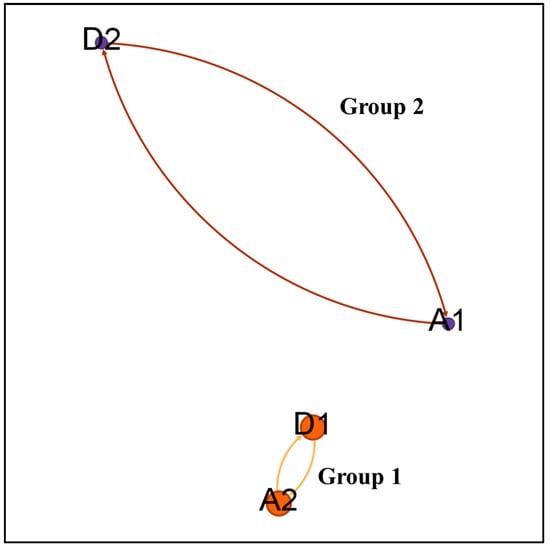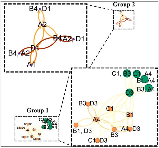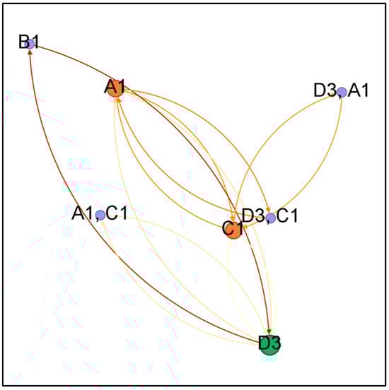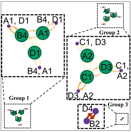 Figure 11 shows the network graph of “Caught-in” accidents. These accidents can be classified into three main groups. Group 1 represents accidents caused by vehicle-based construction equipment owing to “D1” and “A1” from drivers; thus, such accidents can be prevented by placing signal lights. Group 2 refers to accidents that are mainly caused by “A2” owing to “C1; thus, it must be reflected in the safety management plan. Group 3 refers to an accident caused by “Defective protective devices (B2);” it can be managed by posting “Safety rules and signs (D4)” in the workplace.