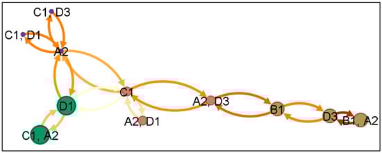 When analyzing ARM results in a table, the association rules between two causes can be analyzed, although there would be some limitations in identifying the rules related to other factors. Therefore, we analyzed the interrelated rules between causes based on the accident types using a network graph. In this graph, each node was proportional to the size of its support and was colored green, orange, or purple. The edges were based on their lift values and were colored brown, orange, and yellow. Figure 7 shows the network graph of the ARM results for the fall incidents. The main causes of fall accidents were analyzed and categorized into one group, and the incidents can be analyzed as a combination of different causes. In particular, “D3” was linked to other major causes; therefore, a thorough safety management plan must be developed and implemented.
