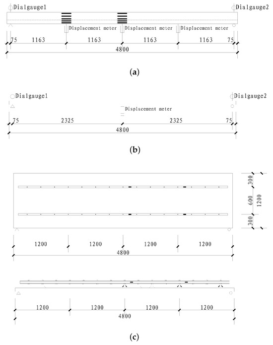 Dimensions and details of 4800 mm specimens: (a) plane reinforcement diagram of prefabricated bottom plate; (b) 1-1cross-section drawn; (c) 2-2 cross-section drawn.
