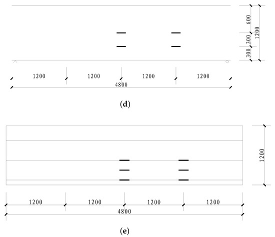 In accordance with the “Technical Code for Precast Concrete Structures” JGJ 1-2014 [13], the experiment was designed to include three prefabricated bottom plates and one composite slab. The parameters of each specimen are presented in Table 2. The arrangement of the reinforcement bars in the prefabricated bottom plates, exemplifying a span of 4800 mm and a width of 1200 mm, is shown in Figure 3.