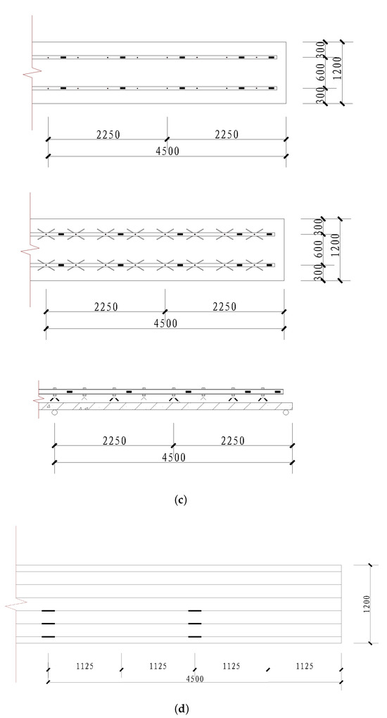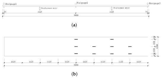 According to the “Standard for Test Methods of Concrete Structures” GB/T 50152-2012 [16] and considering the structural features of the CDB prefabricated bottom plates, loading was ceased when specimens exhibited any of the following indicators, which are deemed to have reached the limit of their bearing capacity: the width of cracks at the location of the main tension reinforcement reached 1.50 mm; breakage of the tension reinforcement in the specimens; the bending deflection reached 1/50 of the span; the bending or instability of the steel tube supports; and the crushing of concrete in the compression zone of the specimens.