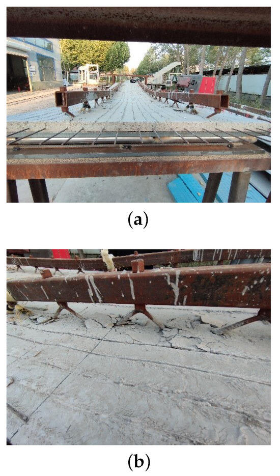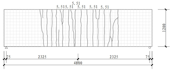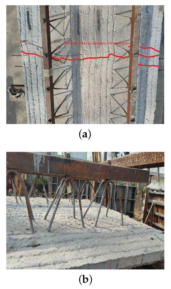 For specimen CHBP4812, the upper-chord rectangular steel tubes were removed when the strength of the composite-layer concrete reached 100%. When the load was increased to 5.51 , six through-cracks appeared at the midspan of the plate bottom, with a width of up to 0.15 mm. As loading progressed, the number of cracks increased, becoming deeper and wider. The through-cracks extended upward along the side of the plate to the junction between the bottom plate and the composite layer, with some cracks continuing to extend into the upper part of the composite layer after extending along the junction by 2–6 cm (Figure 12a). The distribution of cracks at the bottom of specimen CHBP4812 is shown in Figure 13. During the loading process, no brittle fractures occurred in the prestressing steel.