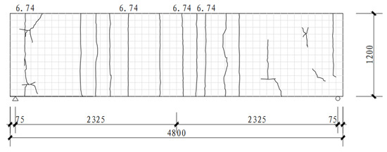 For the prefabricated specimen CDBP4812, the initial reverse camber was 15 mm. When the external load reached 2.45 , the reverse camber basically disappeared, and the bottom plate was laid down in a horizontal position. Prior to the load reaching 6.13 , no visible cracks appeared in the concrete at the bottom of the plate. The deflection increased slowly with each level of loading, and the change in rigidity was not obvious. When the load was increased to 6.74 , four through-cracks with a width of 0.2 mm uniformly appeared in the midspan of the underside of the bottom plate, extending upward along the side of the plate to 1/3–2/3 of its height. When the load was increased to 10.42 , the number of bottom cracks increased, with the cracks extending upward along the side of the bottom plate to 1/2–3/4 of its height. Punching shear failure occurred between the B-side web reinforcement bar and the concrete, and the upper-chord rectangular steel tubes buckled (Figure 6a,b), leading to the cessation of loading. The distribution of cracks at the bottom of specimen CDBP4812 is shown in Figure 7. During the loading process, no brittle fracture occurred in the prestressing steel, and there was no out-of-plane instability in the upper-chord rectangular steel tubes or the web reinforcement bars.