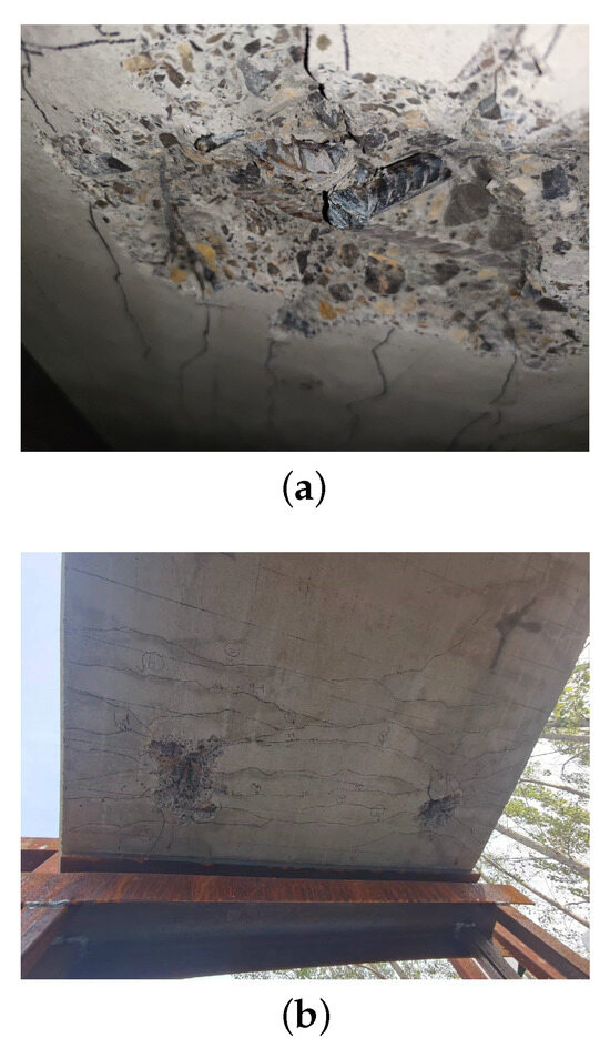 For specimen CDBP9012, the initial reverse camber was 8 mm. When the external load reached 1.96 , the reverse bow basically disappeared, and the bottom plate became horizontal. Prior to the load reaching 4.58 , no visible cracks appeared in the concrete at the bottom of the plate, the deflection increased little at each loading level, and the change in rigidity was not obvious. When the load was applied to 5.23 , a through-crack with a width of 0.1 mm appeared on the underside of the base plate, extending upward along the side of the plate to 1/3–2/3 of its height. When the load was increased to 8.50 , multiple through-cracks appeared at the bottom of the plate, with the cracks extending upward to 1/2–3/4 of the plate’s height. Delamination damage occurred in the reinforcement of the web reinforcement bars on the A-side (Figure 8a,b), leading to the cessation of loading. The distribution of cracks at the bottom of specimen CDBP9012 is shown in Figure 9. During the loading process, no brittle fracture occurred in the prestressing steel, and there was no out-of-plane instability in the upper chord rectangular steel tubes or the web reinforcement bars.