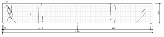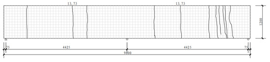 For specimen CDBK9012, the initial reverse camber was 53 mm. When the external load reached 4.58 , the reverse camber basically disappeared, and the bottom plate became horizontal. When the load was applied to 11.11 , a through-crack with a width of 0.1 mm appeared on the upper surface of the middle support of the specimen (Figure 10a). When the load was increased to 13.73 , two through-cracks appeared on the underside of the specimen, extending upward along the side of the base plate to 1/2–3/4 of its height. When the load increased to 17.32 , multiple through-cracks appeared at the bottom of the plate, with the cracks extending upward to 1/2–3/4 of the plate’s height, and the web reinforcement bars buckled (Figure 10b), leading to the cessation of loading. The distribution of cracks at the bottom of specimen CDBK9012 is shown in Figure 11. During the loading process, no brittle fracture occurred in the prestressing steel, and there was no out-of-plane instability in the upper chord rectangular steel tubes or the web reinforcement bars.