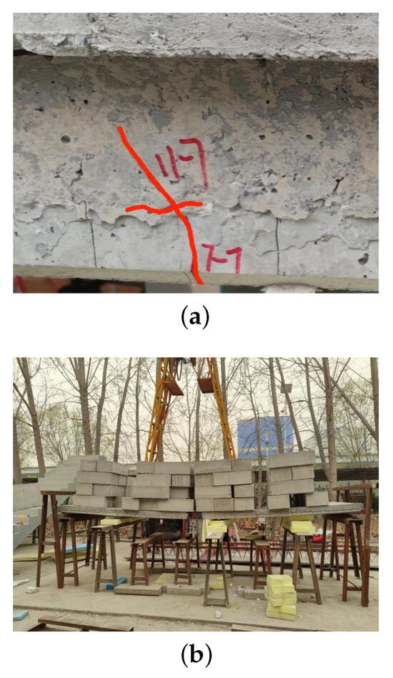 Failure characteristics of specimen CHBP4812: (a) side cracks of specimen CHBP4812; (b) specimen CHBP4812’s deflection exceeds the limit.