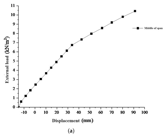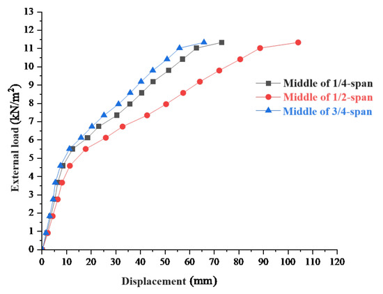 The load–displacement of the composite plate specimens is shown in Figure 16. There are obvious elastic and elasto-plastic phases in the loading process of the composite plate specimens [17,18]. Table 7 presents the cracking load and deflection of the CDB composite plate specimens. The maximum unsupported span of these composite plate specimens can reach up to 4.8 m, which is larger than the support spacing for typical composite plates. This effectively reduces the number of supports while achieving a cracking load greater than 3.5 and deflection less than l/200, meeting the design requirements for general office and residential buildings [19].