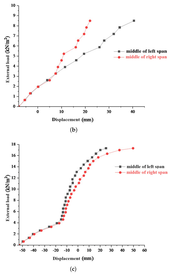 Before loading, the specimens underwent preloading, with each load level being 20% of the cracking load and each load level maintained for 15 min. This phase primarily checked the stability of the supports and ensured that the instruments and loading equipment were in a normal condition, including zeroing the instruments. After preloading, formal loading commenced. For specimen CDBP4812, each load level was 0.61 ; for specimens CDBP9012 and CDBK90129, each load level was 0.65 .