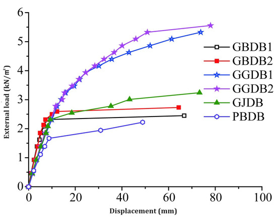 The load-displacement curve of six concrete composite slabs with steel lattice girders is displayed in Figure 15 [6]. Basic information of the load-displacement curve of six concrete composite slabs with steel lattice girders is shown in Table 5. These slabs are similar in size to CDBP4812, enabling a direct and accurate comparison. First of all, comparing the maximum load bearing capacity, CDBP4812 has a maximum load bearing capacity of 10.42 , which is significantly higher than GGDB2’s capacity of 5.56 . Second, comparing the displacements, it is evident that the maximum displacement of CDBP4812 is similar to that of GGDB1 and GGDB2. Finally, comparing the slopes, the loading/displacement values of CDBP4812 are significantly higher than any of the concrete composite slabs with steel lattice girders in Figure 15, and therefore, the rigidity properties of CDBP4812 are higher than these slabs. In terms of a parametric comparison, CDBP4812 has a high load bearing capacity and rigidity, and its mechanical properties can surpass those of the majority of concrete composite slabs used in current engineering applications.