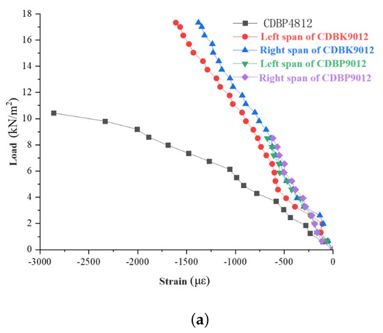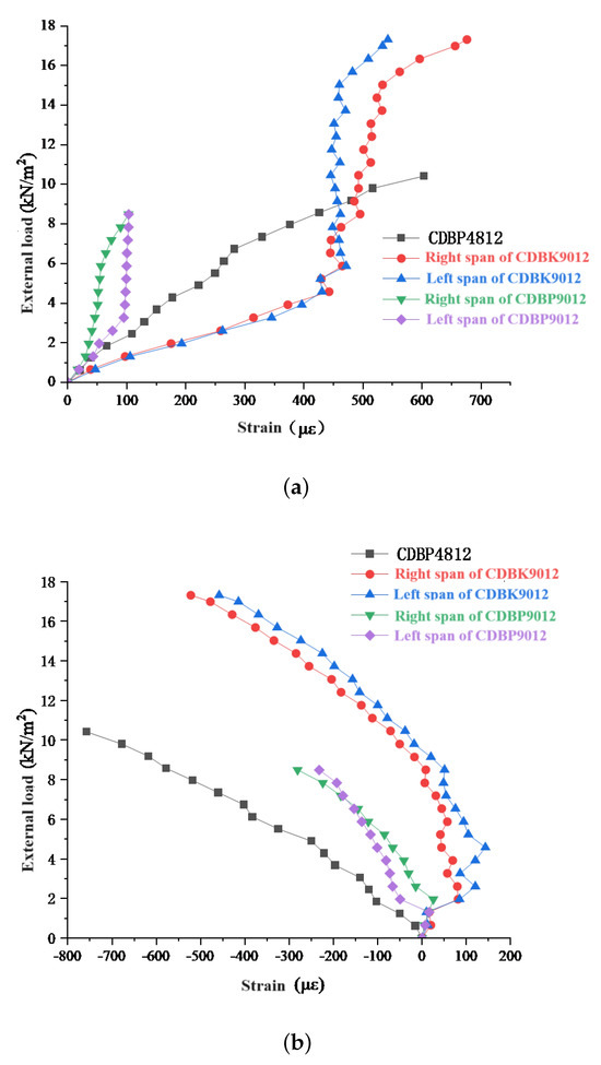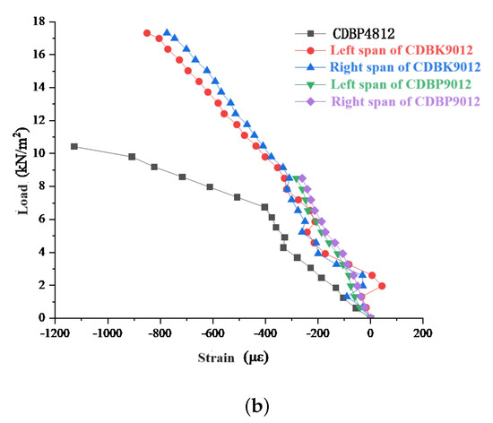 The strain variation curves of concrete at the top and bottom of the span middle for each prefabricated bottom-plate specimen are shown in Figure 17. Prior to cracking, the strain curve of the concrete is approximately linear, indicating that the concrete is in an elastic phase. After cracking, the slope of the concrete strain curve decreases, and the increase in concrete strain is greater than the increase in load, indicating that the concrete is in an elasto-plastic phase. Comparing CDBP9012 and CDBK9012, the strain variation curve of CDBK9012 is significantly better than that of CDBP9012.