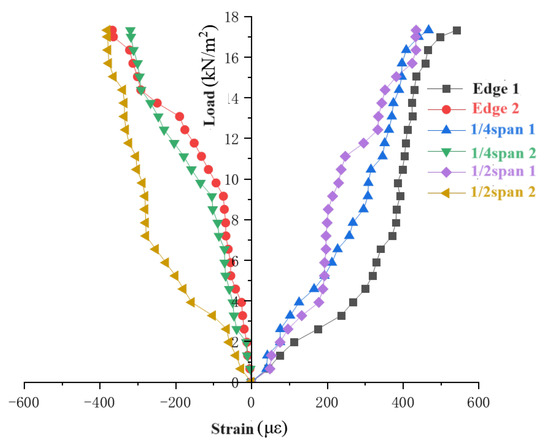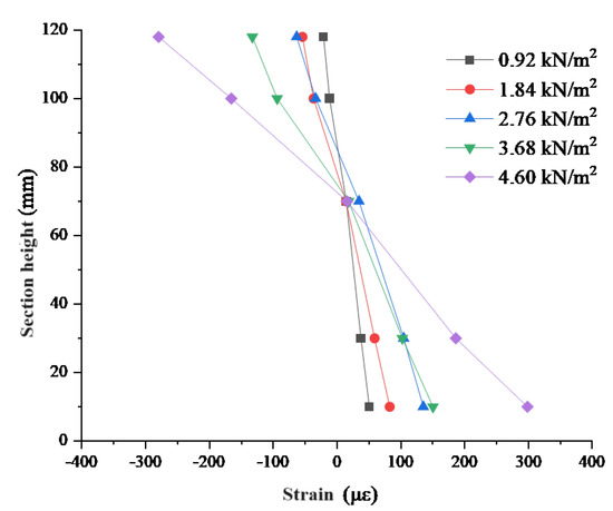 The variation curves of concrete strain at the span middle slab side of the composite slab specimens are shown in Figure 18. The horizontal axis represents the longitudinal strain of the concrete at each measuring point across the section, while the vertical axis represents the section height, with 0 mm indicating the bottom of the plate and 120 mm indicating the top of the plate. It can be observed that during the elastic phase, the strain of the concrete along the side of the plate distributes linearly with the section height, indicating that the composite plate’s stress conforms to the assumption of plane sections [6,17].