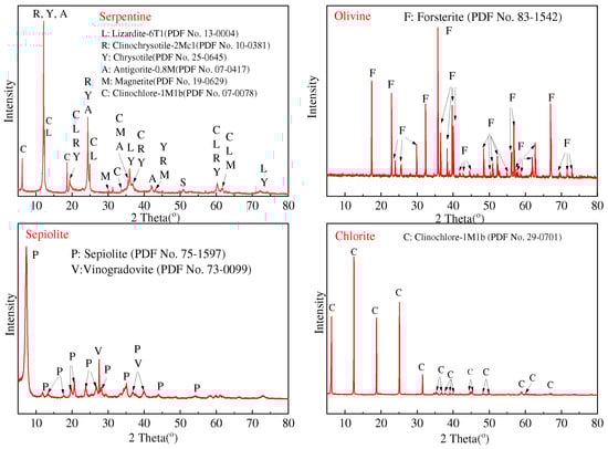 Serpentine, peridotite, sepiolite, and chlorite are derived from Shanlin Shiyu Mineral Products Co., Ltd., Guzhang County, Xiangxi Prefecture, Hunan Province. The chemical composition is shown in Table 1, the X-ray diffraction is shown in Figure 1, and the particle size distribution of the raw materials is shown in Figure 2. Serpentine consists mainly of serpentine group minerals such as Elisserite, fibrous serpentine and leaf serpentine, and plagiochlorite and contains a small amount of magnetite. Peridotite is mainly composed of magnesium olivine. Chlorite is mainly composed of plagiochlorite and brittle chlorite. The silica and magnesium contents of the four minerals are high, which provide rich silicon and magnesium sources for the preparation of hydrated magnesium silicate cementing materials. The particle size distribution analysis of raw materials (as shown in Figure 2) indicates that the mean particle size of serpentine, olivine, sepiolite, and chlorite is 70 μm, 80 μm, 80 μm, and 70 μm, respectively.