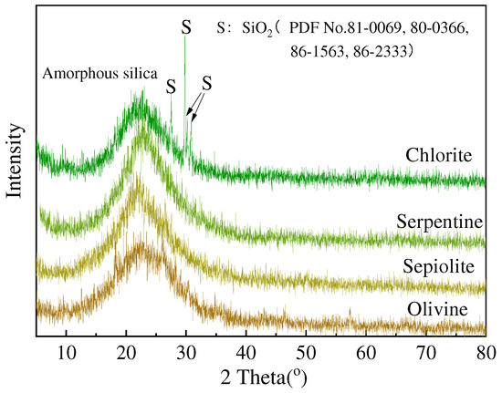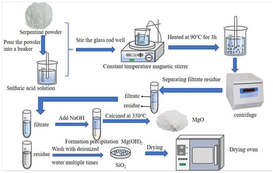 The schematic diagram of the experiment is shown in Figure 3. The raw materials (serpentine, olivine, sepiolite, and chlorite) were dissolved in a 30% H2SO4 solution with a solid–liquid ratio of 1:5 and heated at 90 °C for 3 h. After dissolution, the solution was separated from the residue using a centrifuge. The residue was washed five times with deionized water and then dried in an oven at 50 °C until a constant weight was reached. The dried residue was sealed and stored for later use.