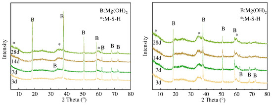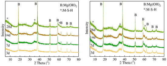 Figure 7, Figure 8, Figure 9 and Figure 10 are XRD patterns of the paste of the residue and MgO in 50 °C and 80 °C water. In the Figure 7, Figure 8, Figure 9 and Figure 10, there is no distinct MgO diffraction peak, indicating that most of MgO has hydrated after 3 d. The characteristic peaks of M-S-H at the 2θ value of 5.0°–10.0°, 35.0°, and 59.9° can be observed [18,19] after 3 d. With the hydration time and the curing temperature, the height of these diffraction peaks gradually increases, while the corresponding Mg(OH)2 diffraction peaks decrease. The mineral diffraction peaks observed around 2θ at 35° in the samples prepared from chlorite may be attributed to minerals such as augite-Ca (PDF No. 24-0201) present in the chlorite raw materials.