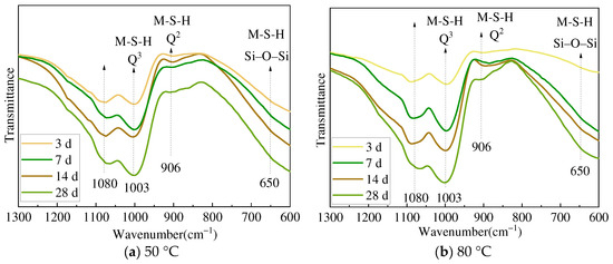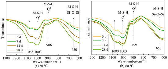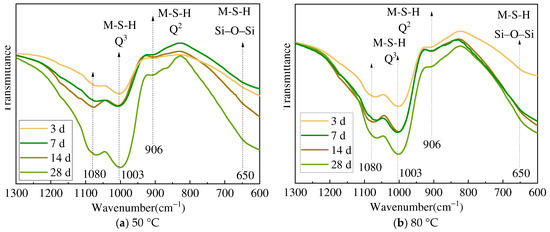 Figure 11, Figure 12, Figure 13 and Figure 14 show the FTIR spectra of the residue and MgO paste at different reaction times under curing at 50 °C and 80 °C. The two absorption bands correspond to the formation of M-S-H. Specifically, the absorption band within the range of 950 to 1100 cm−1 is attributed to the Q3 Si-O vibration, while the absorption band within the range of 870 to 920 cm−1 is attributed to the Q2 Si-O vibration [5,19]. Additionally, the absorption peak observed near the wavenumber of 650 cm−1 can be attributed to the bending vibration of Si-O-Si [20]. With an increase in curing time, the intensities of these three absorption bands are significantly enhanced, indicating a gradual increase in the formation of hydration products. The absorption band at the wavenumber of 1080 cm−1 assigned the vibration of Si-O-Mg in M-S-H [7,21,22] also increases with age. These results are consistent with the XRD results.