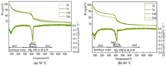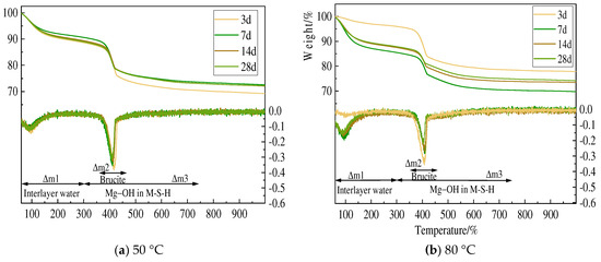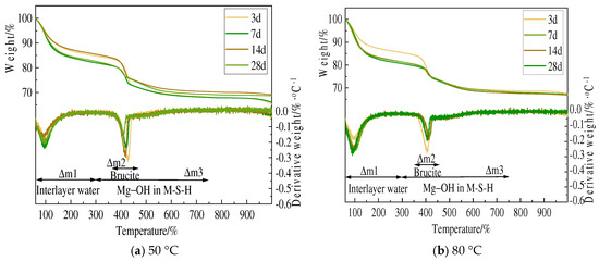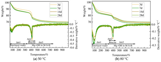 Upon curing at 50 °C for 3 days, the mass loss due to Mg(OH)2 dehydroxylation (Δm2) reaches maximum value, gradually decreasing thereafter. Furthermore, at 28 days, the Mg(OH)2 content is only about 70–80% of that of the four samples cured in 50 °C for 3 days. A higher-temperature curing accelerates the hydration reaction. For samples cured at 80 °C, this ratio decreases to 48–68%.