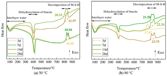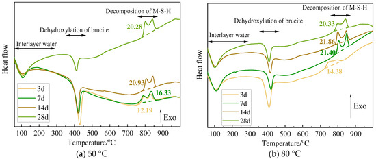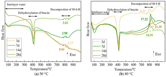 The DSC curves of M-S-H pastes prepared with serpentine, olivine, sepiolite, and chlorite are presented in Figure 19, Figure 20, Figure 21 and Figure 22. On the DSC curve, the endothermic valley between 50 and 300 °C is caused by the removal of interlayer water from M-S-H. The second endothermic valley near 300~400 °C corresponds to the dehydroxylation of Mg(OH)2. The heat release peak at about 850 °C is the heat release during the M-S-H recrystallization to form SiO2 and enstatite (MgSiO3) [6,24] or SiO2 and Mg2SiO4 [25]. The heat release peak area of this region is calculated and illustrated in the figures. The heat release of the sample cured at 80 °C is greater than that of the sample cured at 50 °C; that is, the amount of M-S-H formed is higher at 80 °C. Furthermore, with the extension of the curing time, the heat release gradually increases, reaching its maximum at 14 days and slightly decreasing at 28 days (except for the sample prepared with olivine).