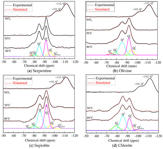 Figure 23 displays the 29Si NMR spectra of the amorphous silica and M-S-H samples cured at 50 °C and 80 °C. The deconvolution results for these spectra at 28 d are summarized in Table 4. According to references [27,28,29], the chemical environment of 29Si is denoted by Qn, where n indicates the number of bridging oxygen atoms shared between a silicon tetrahedron and the surrounding silicon tetrahedra. In the spectrum of amorphous silica, the chemical shift at −112 cm−1 corresponds to the Q4 signal, while −102 cm−1 represents the Q3 signal [30]. The 29Si MAS NMR spectra of amorphous silica obtained from the dissolution of four silicate minerals show no significant distinction for the aforementioned Q3 and Q4 signals. It is noted that the Q4 signal in the M-S-H sample nearly vanishes after 28 days of curing. Furthermore, after 28 days of curing at 50 °C, the remaining Q3 (−102 cm−1) signal is slightly higher than that which underwent curing at 80 °C. From the relative content of the remaining Q3 (−102 cm−1) signal, a higher degree of hydration occurs at elevated curing temperatures. Due to the highest residual Q3 content in amorphous silica, the M-S-H prepared from sepiolite has the lowest degree of hydration. Conversely, the M-S-H prepared using olivine as the raw material has the highest degree of hydration.