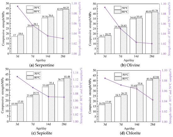 The compressive strength of hydrated magnesium silicate paste is shown in Figure 24. The figure clearly demonstrates that the compressive strength of M-S-H gradually increases with the curing time, surpassing 38 MPa at 28 days. The M-S-H specimens cured at 80 °C exhibit higher strength compared to those cured at 50 °C. However, the strength ratio of specimens cured at 80 °C to those at 50 °C gradually decreases, indicating that curing temperature has a more significant impact on the early compressive strength of the specimens. With an increase in curing time, the strength difference caused by environmental temperature gradually diminishes.