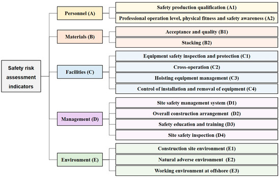 With the aid of the accident causation theory and the existing research results on the safety risk of high-pile wharf constructions [5,14,46], the safety risk assessment indicators of the project can be constructed, as shown in Figure 1. It should be pointed out that the gray correlation analysis method is used to simplify the above indicators [47]. Under the condition of ensuring that the classification ability remains unchanged, the indicators that cannot distinguish the results of the evaluation object data are filtered out. Gray correlation analysis has no special requirements for the sample distribution state and the number of samples, and its analysis and calculation of data can be completed through simple programming, eliminating the tedious calculation process. In addition, gray correlation analysis can ensure the accuracy of safety risk evaluations without losing effective information while filtering and deleting the redundant safety risk factors, which effectively reduces the time for the safety evaluation of the high-pile wharf construction process. Specifically, a hierarchical research structure is utilized to construct the indicator system, in which safety risk management for the construction of a high-pile wharf is taken as the target layer. The principle layer is composed of five aspects, namely, project personnel (A), materials (B), facilities (C), management (D) and environment (E). The specific evaluation indexes are included as the scheme layer, which contains indicator factors related to the actual projects. The specific evaluation indexes in the scheme layer are denoted as A1, A2, B1, B2, …, E1, E2, E3, which can be found in Figure 1.