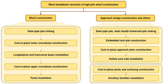 As shown in Figure 2, the construction process of the project consists of three major parts, namely, the wharf construction, approach bridge construction and other facilities installation. Among them, according to the components and construction methods involved, the construction of the wharf includes five divisions: steel pipe pile sinking, cast-in-place lower crossbeam construction, longitudinal and transverse beam installation, cast-in-place upper crossbeam construction and panel installation. The construction of the approach bridge includes four divisions: steel pipe pile, steel-sheath immersed pile sinking, embedded rock piles construction, cast-in-place approach piers construction and hollow core slab installation. Moreover, the construction of other facilities includes cast-in-place joints and surfacing construction and ancillary facilities installation.