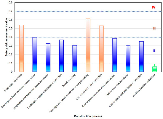 Furthermore, it can be found in Figure 5 that the construction safety risk assessment of the steel pipe pile-sinking construction of the wharves and approach bridges in this project is presented as orange color, which implies a higher risk. Reviewing the scores of the safety risk assessment indicators for pile foundation construction in detail, the scores given by SB and SC were significantly higher than those of other sub-processes, which mainly related to the large scale of the pile foundation project. In fact, a large amount of pile foundation constituent materials and large-scale machinery and equipment were utilized in the construction process of those sub-processes, and thus the corresponding construction safety risk levels were higher. This inspired managers to develop improvement measures based on the assessment data, such as reducing the number of large machinery and equipment with repetitive functions, adopting multifunctional construction machinery or carrying out construction simulations based on the BIM platform to streamline and optimize the construction process of pile sinking and the types of materials required to reduce the potential construction safety risks.