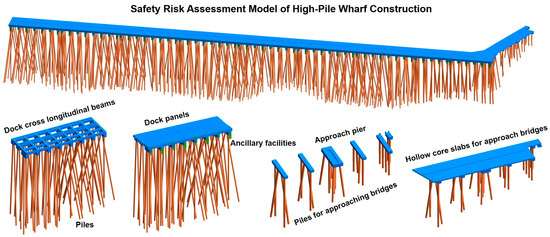 The high-pile wharf is increasingly becoming one of the most widely used structural forms due to its significant advantages such as lightweight construction, good wave reduction effect and reduced use of sand and gravel [1]. However, as a typical water transportation project, the construction of a high-pile wharf involves aerial work and underwater work. The prefabrication, transportation and installation of large components for the project involves a wide range of construction materials and machinery, which brings more and more huge challenges for the construction safety management of the project [2]. In particular, the wharf construction is usually located in the offshore and open sea area, which is greatly affected by meteorological disasters and has very complicated geological conditions [3]. The large investment amount and project scale of a high-pile wharf project leads to a long construction period and a large number of participants in the project, which leads to increased difficulty in construction and the coordination of the construction process [4]. If the materials, equipment and personnel at the construction site are not well coordinated and managed, it is likely to cause safety accidents due to insufficient safety control measures, which not only delays the construction period but also threatens the safety of personnel [5,6]. For instance, in 2020, during the construction of a general cargo terminal in Wuhu, China, a collapse occurred during the pouring of concrete for the cantilever section of the upper crossbeam on the upstream side, which resulted in three operators who were working on the project to fall into the river, two deaths and a serious direct economic loss of more than CNY 3 million. Under the current situation of gradually increasing project scales and multiple project participants, the traditional project safety assessment and construction methods can no longer accurately and completely represent the construction situation. It is necessary to improve the construction safety risk assessment system to support the safety risk management of modern engineering projects, especially for high-pile wharf constructions.