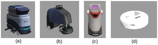 4 models of cleaning robots were chosen, shown in Figure 2, with their specifications documented in Table 1. The models include a large-sized cleaning robot (CleanerBot1 [70] ), 2 medium-sized cleaning robots,(CleanerBot2 [71] and CleanerBot3 [72]), and a small-sized domestic robot (iRobot-Create [73]). The models were chosen to provide robot diversity based on their width, length, and height.