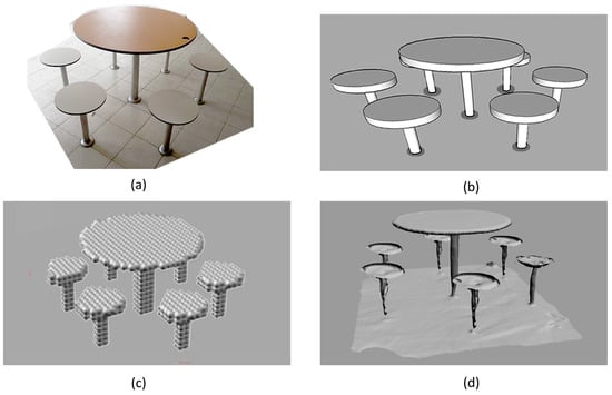 Modelling techniques: (a) test site: 6- seater fixed round dining table, (b) newly developed 3D Polygonal Model, (c) 3D reconstructed Voxel mesh from PCD, (d) 3D reconstructed Poisson surface mesh from PCD.