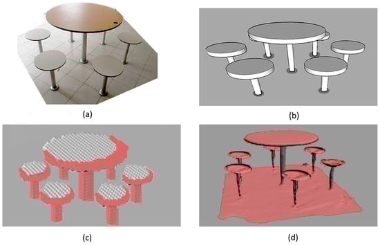Evaluation of modelling techniques. (a) Site:6-seater fixed round dining table, (b) newly developed 3D Polygonal Model—Replicates data, (c) 3D reconstructed Voxel mesh from PCD: Loss of geometric curvature details, (d) 3D reconstructed Poisson surface mesh from PCD: Undulated and incomplete surfaces. Red areas indicate the loss of geometric features.