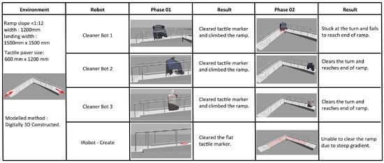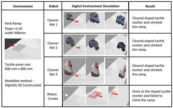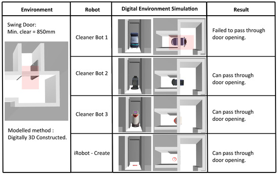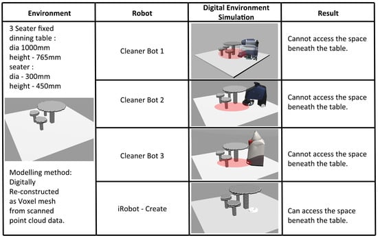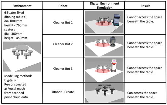 From the simulations, the different specifications of each robot have enabled the robots to interact differently with the built environment. The results of the simulations provided insights into how the environment or robot can be modified in order to achieve a successful deployment. While all robots are used for cleaning purposes, the simulations can filter which are the most suitable robots based on the nature of the built environment.
