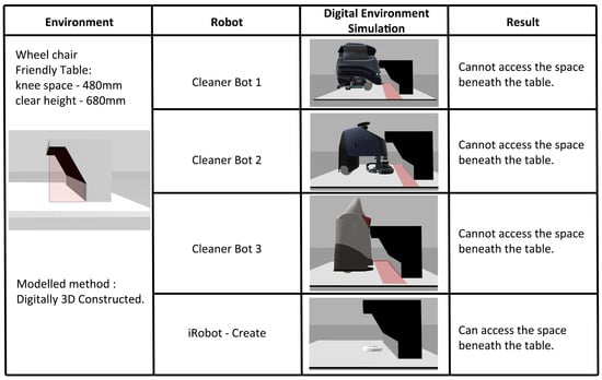 Unlike the previous simulations that consisted of both tables and chairs, the wheelchair-friendly table as displayed in Figure 10, does not have chairs that would obstruct the entry point of cleaning robots. However, despite this, the height clearance only enables iRobot-Create to successfully cover the space below the table, making it the most suitable robot for such cleaning deployments. If other robots were to be used, this could cause damage to the robot’s frame and external sensors, incurring unnecessary repair costs.