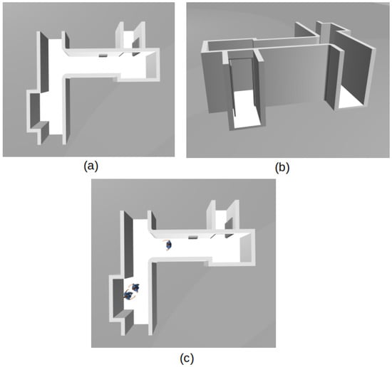 (a) Top view of the residential shared environment—corridor without humans. (b) Isometric view. (c) Top view of the residential shared environment—corridor with humans.