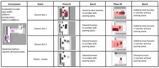 From Figure 12, the CleanerBot1 is unable to successfully navigate the passing space due to human obstruction, which could result in a collision leading to injuries to the human and damage to the robot. Along the corridor, only the iRobot-Create can navigate successfully while the CleanerBot2 and CleanerBot3 are stuck due to width constraints.