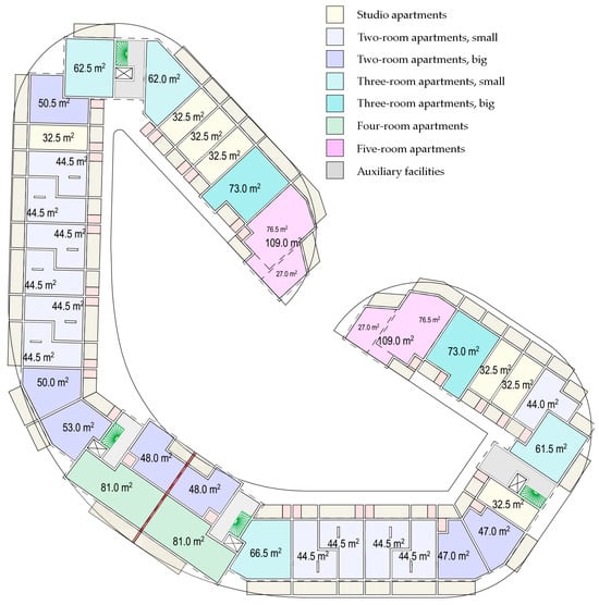Apartment distribution diagram for the base floor of the studied apartment building (image by authors).