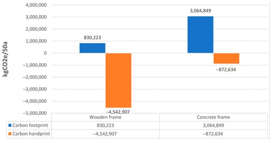 From a low-carbon perspective, another crucial aspect to consider in selecting the structural frame material is the carbon handprint, which measures the positive climate impacts stemming from building construction. Choosing a CLT frame as the load-bearing structure for the upcoming apartment building leads to the creation of over 3.67 million additional kilograms of carbon dioxide equivalent in positive climate impacts over a 50-year analysis period compared to selecting a concrete load-bearing frame. The climate benefits associated with the massive wooden frame are, remarkably, 420% greater than the positive climate impacts caused by the concrete frame, as expressed in Equation (2):